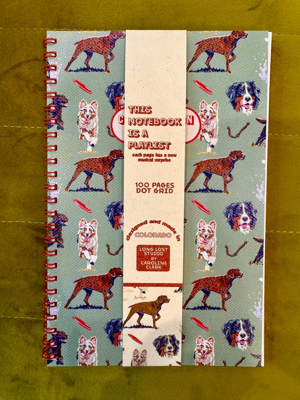 This notebook is a playlist! Each page has a small QR code to a different song :) Spiral bound composition notebook with dot-grid pages, perfect for taking notes, sketching, journaling, or list-making, while the fun dog pattern adds a touch of personality. Printed locally right across the street from my art studio in Colorado Springs!
