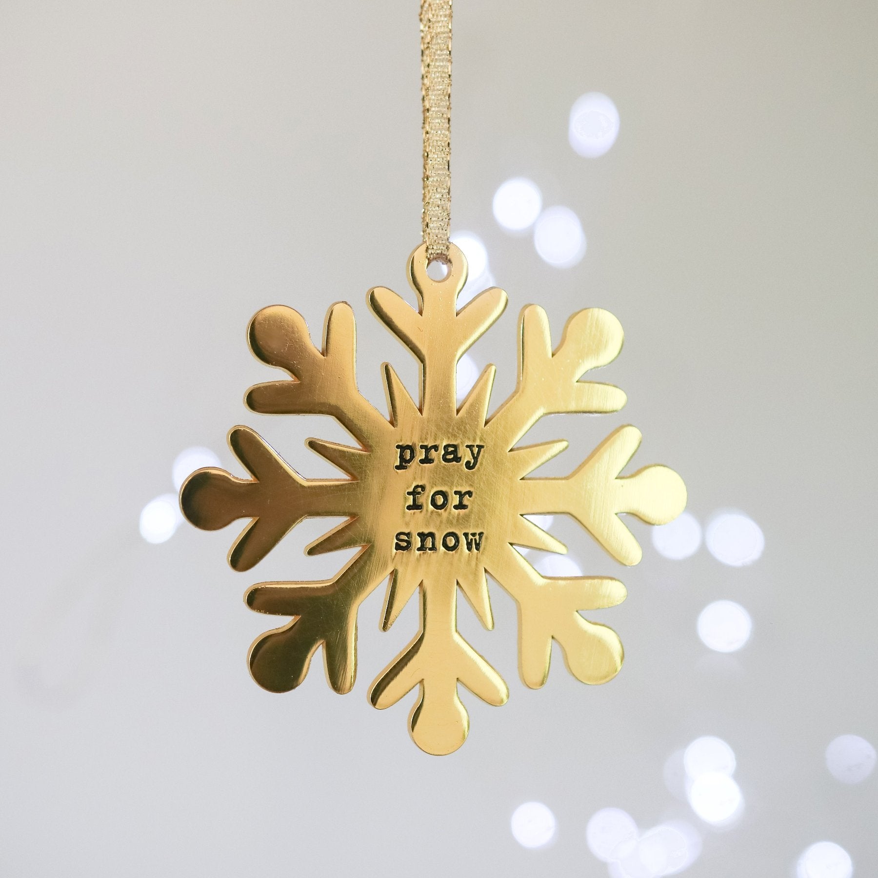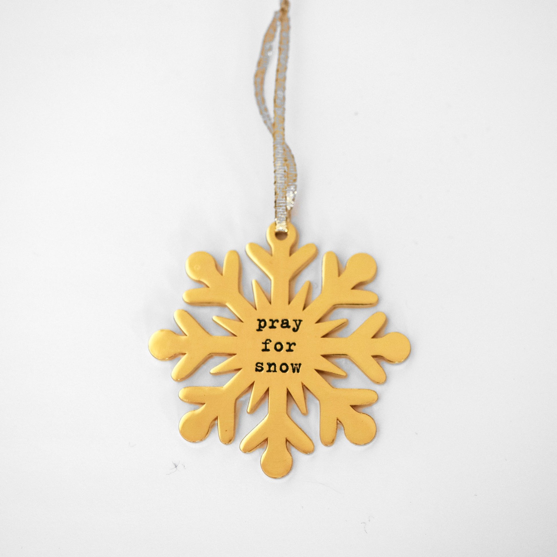 This elegant holiday ornament, “Pray for Snow,” features a luxurious gold-colored finish that gleams under the lights. It is double-sided, perfect for hanging on your Christmas tree. The ornament comes with a delicate gold ribbon for easy hanging.