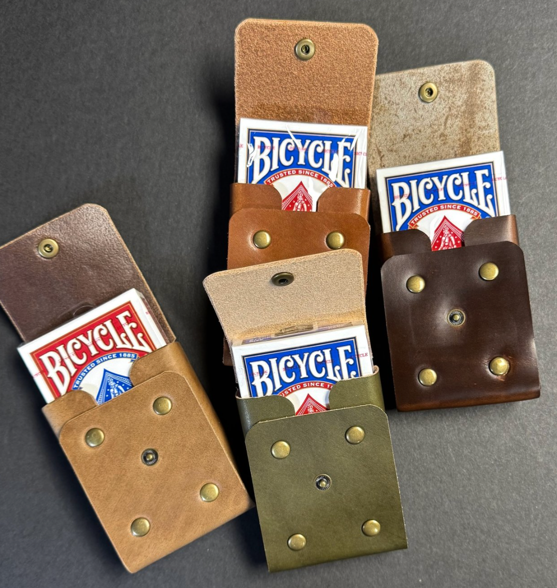This leather playing card case offers a stylish and protective way to store a deck of cards. Crafted from high-quality leather, from American tanneries. The snap closure ensures easy access for game nights, making it both a functional accessory and a refined statement piece for card enthusiasts. Includes a deck of cards.