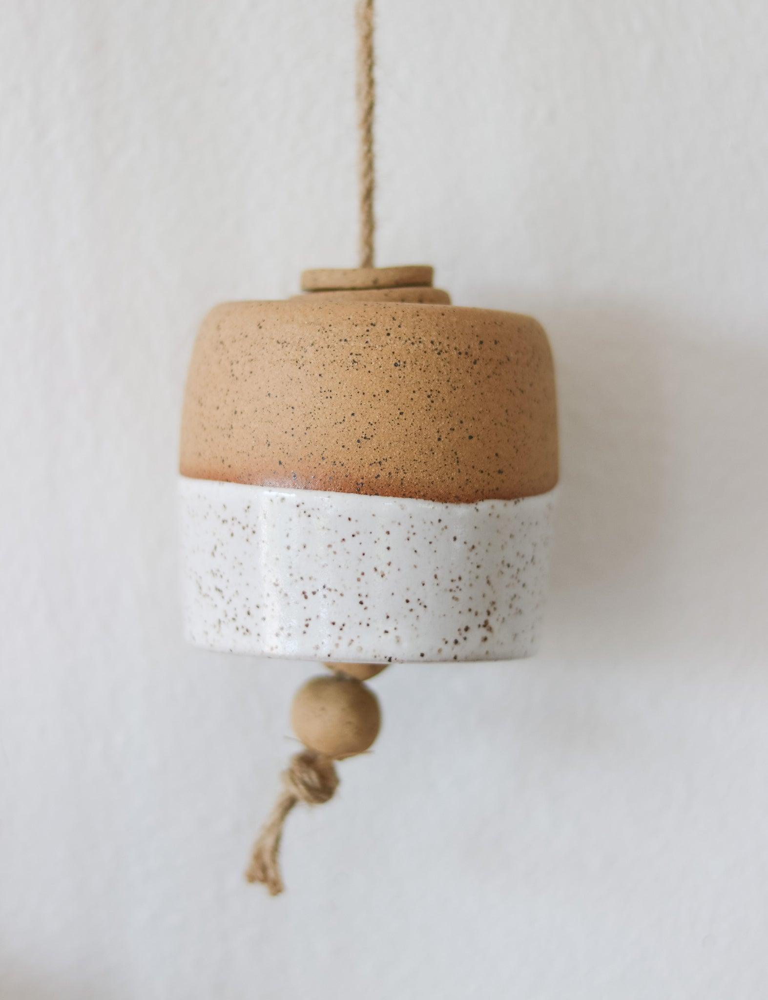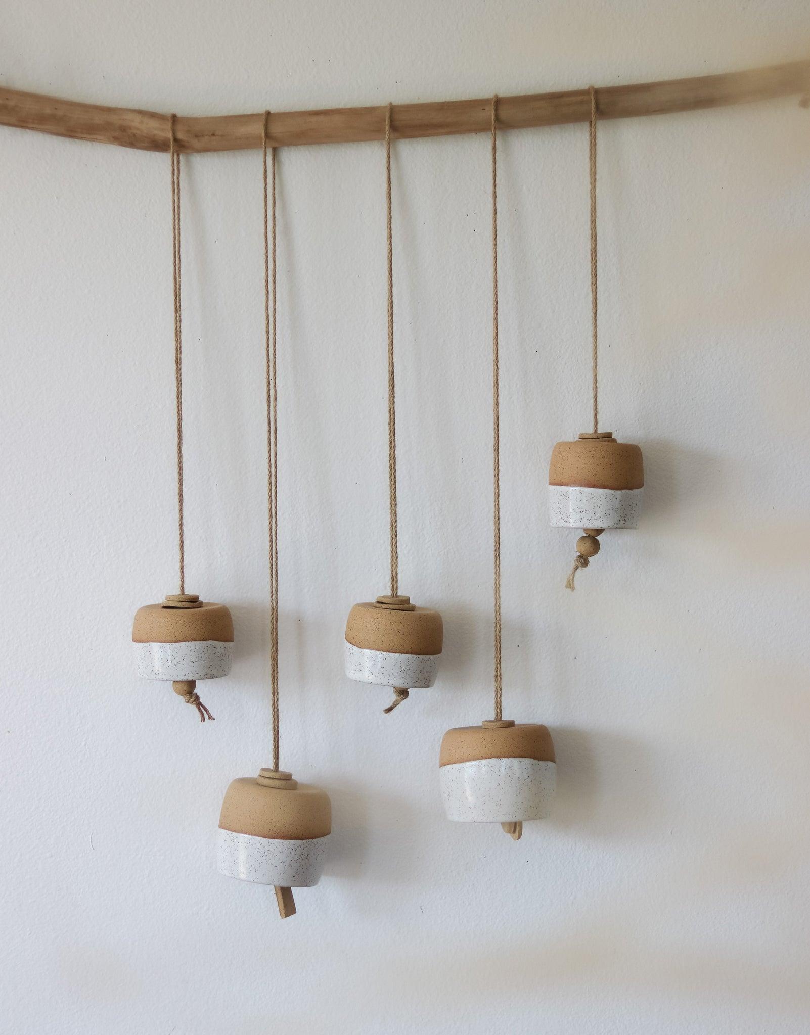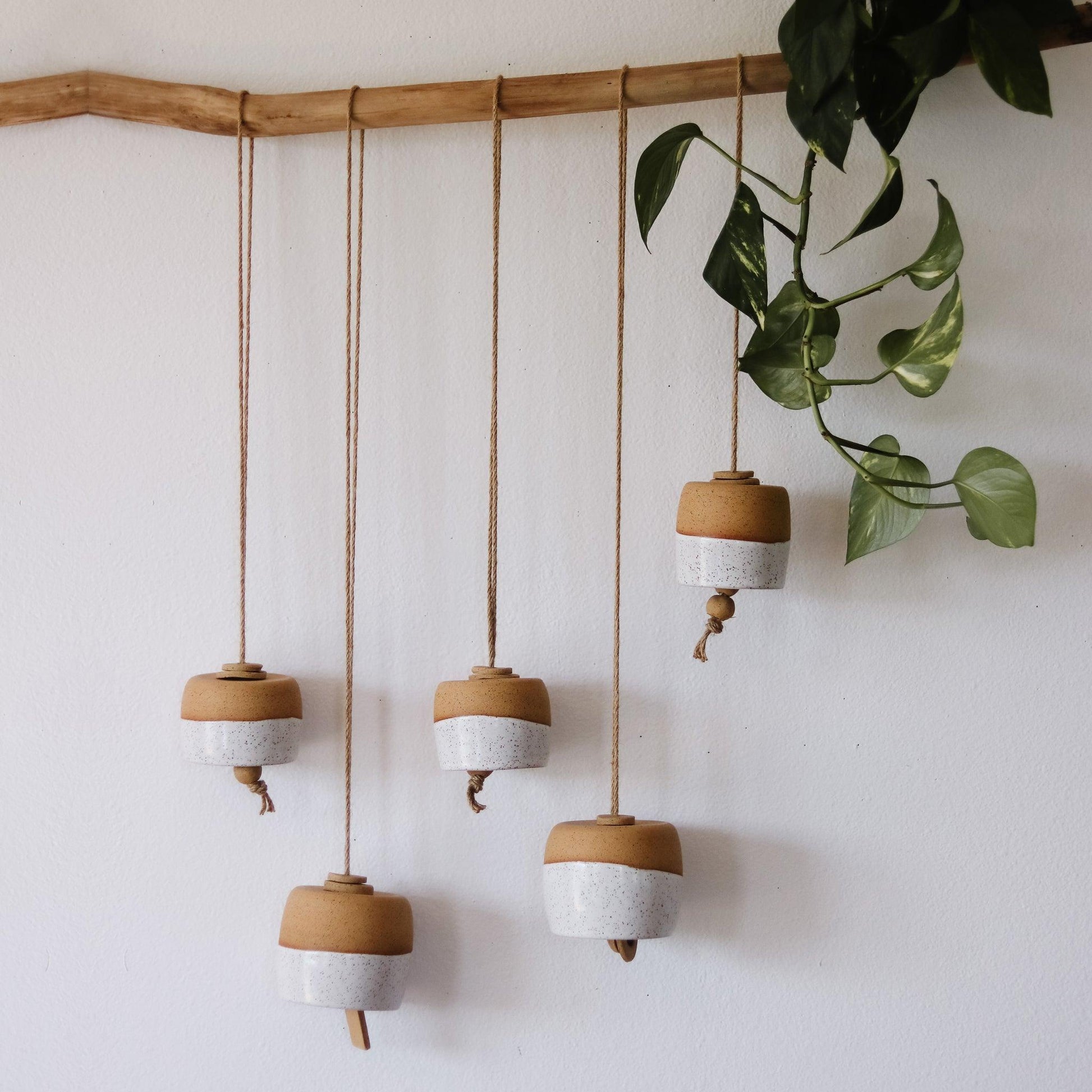 These stunning handmade hanging bells are perfect to hang on the wall or even outside. They are stoneware with a white speckled glaze.